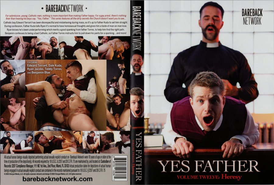 For submissive young Catholic men, nothing is more important than making father happy. For a gay priest, there's nothing finer than hearing his boys say yes father. Yes Father 12: Heresy features all the dirty secrets the Church doesn't want you to see. Catholic boy Edward Terrant has been disrespectful during mass, so it's up to Father Kuda to set him straight. During confession, Father Kuda tells Ryan it's normal to have homosexual thoughts and gives him a taste of man-on-man love. Ryan knows he's been underperforming, which merits a good spanking from Father Torres, to help him find the right path. Benjamin confesses to being a bad Catholic, so Father Torres instructs him to pull down his pants for a spanking - and more. Cast: Benjamin Blue, Dale Kuda, Edward Terrant, Ryan Jacobs, Teddy Torres